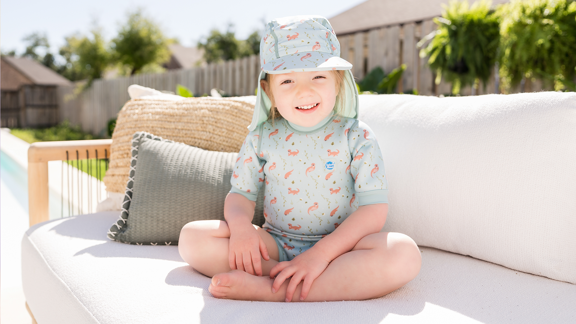 Make a splash with our Playful Otters swimwear – a fun and friendly unisex design for babies and toddlers who love the water! Featuring a soft green base and an adorable repeat print of cheeky otters, this charming animal print swimwear is perfect for little nature lovers.