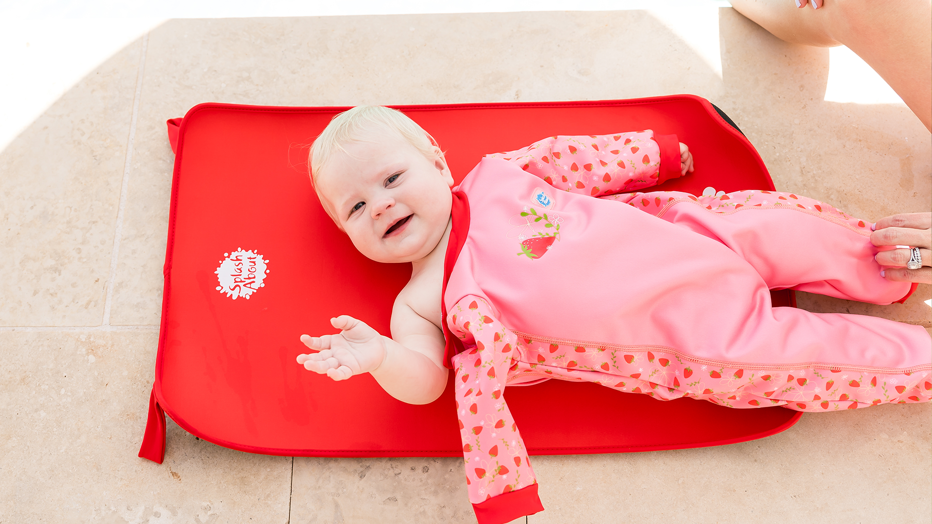 Our Strawberry Fields swimwear range is the ultimate in style and on-trend fashion for little girls. This adorable red and pink strawberry print looks sweet on babies and toddlers, whether they’re staying warm in the pool or enjoying sun protection on the beach.
