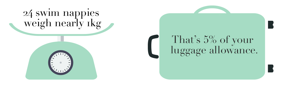Save even more space in your suitcase with Happy Nappy swimming costumes, wetsuits and sunsuits with integrated reusable swimming nappies.The Happy Nappy weighs just 60g, thats 94% less than 2 packs of disposables